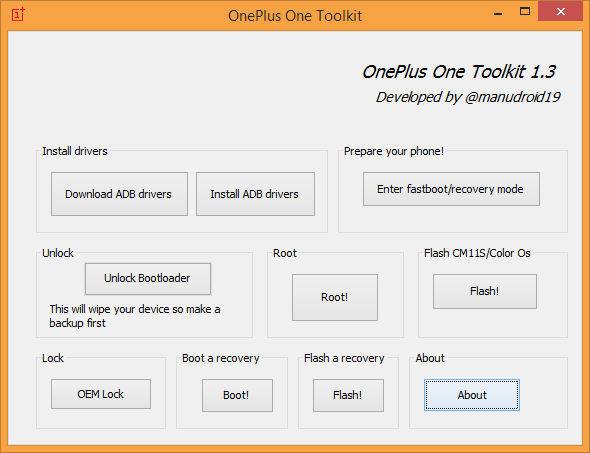 Before you can use any of the features of the Toolkit, First you need to enable Developer Options on the Oneplus One. Goto Settings > About Phone > Click Build number 7 times. Go back out then in settings you’ll see a new option labeled “Developer Options” Then make sure there is a check mark next to USB Debugging on the phone.